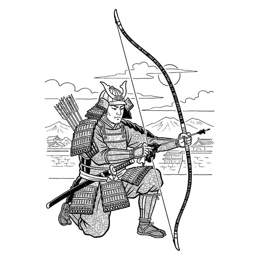 弓の使い手が手ぐすね引く様子など実際に見ることはめったにない。そこでAIの“Google Gemini”に指示してモノクロのイラストを描いてもらうことにした。何度も指示を変えて出来上がったのが下図である。